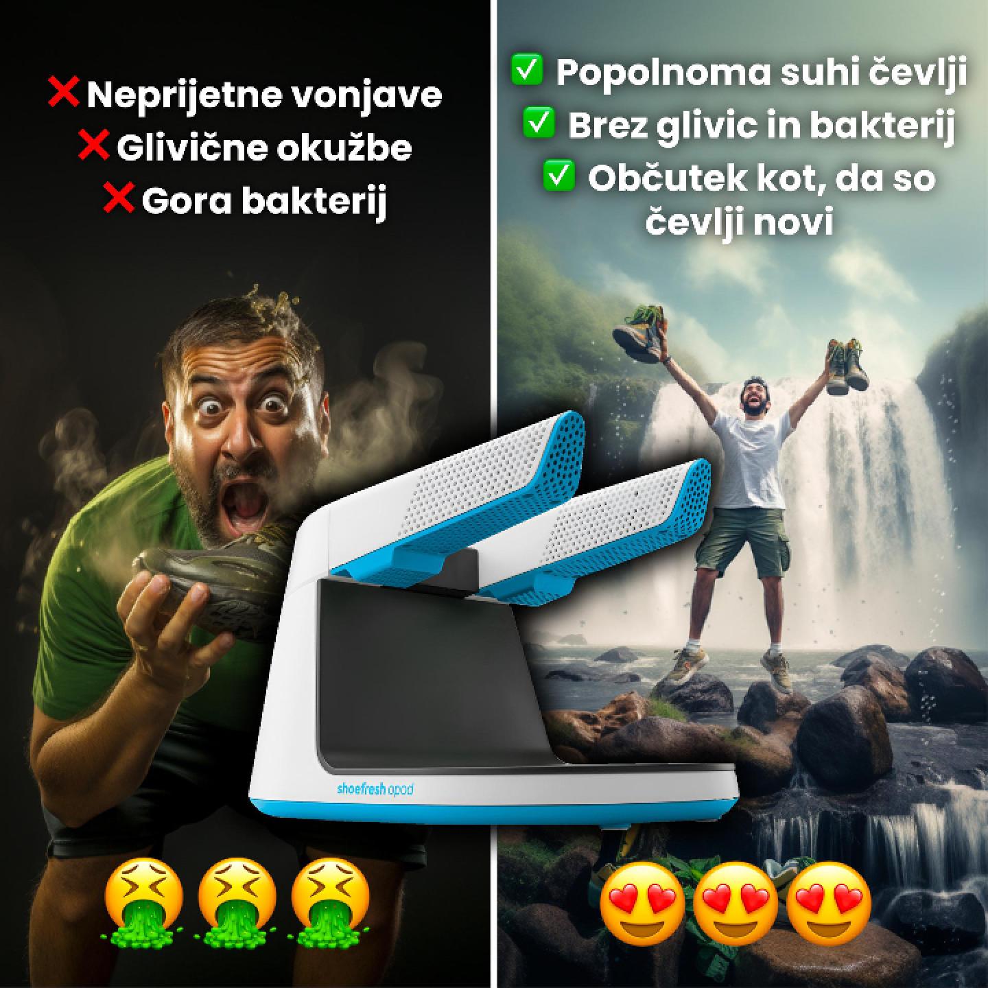Shoefresh je inovativna rešitev za vsakodnevne težave z neprijetnimi vonjavami in bakterijami v vaših čevljih. Ta pametni aparat čisti, suši in osveži obutev, pri čemer uporablja napredno tehnologijo ozona in toplote. Shoefresh poskrbi, da so vaši čevlji vedno sveži, brez vonjav in pripravljeni na novo uporabo.